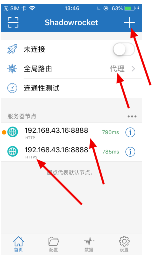 - 在手机端借助代理软件App,按照如下设置。打开代理软件App-首页右上角的加号